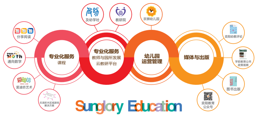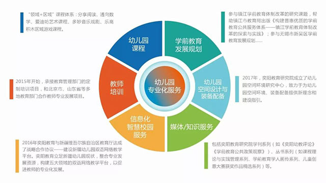 在幼儿园的专业服务领域,以幼儿园的需求为中心,专业化程度较高的领域有幼儿园发展规划、幼儿园课程、教师培训、媒体 / 知识服务、信息化 / 智慧校园服务、幼儿园空间设计与幼儿园装备。奕阳教育的专业服务从产品中心到用户中心,从课程领域逐步扩展到其他领域,通过自身业务扩展和同业机构的战略合作,为幼儿园发展提供以专业化为基础的集成式服务。 |